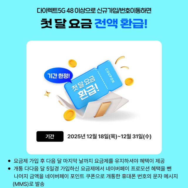 - 첫 달 요금 전액 환급 : 개통 다음다음 달 5일경, 첫 달 납부한 요금을 전액 네이버페이로 돌려받습니다.